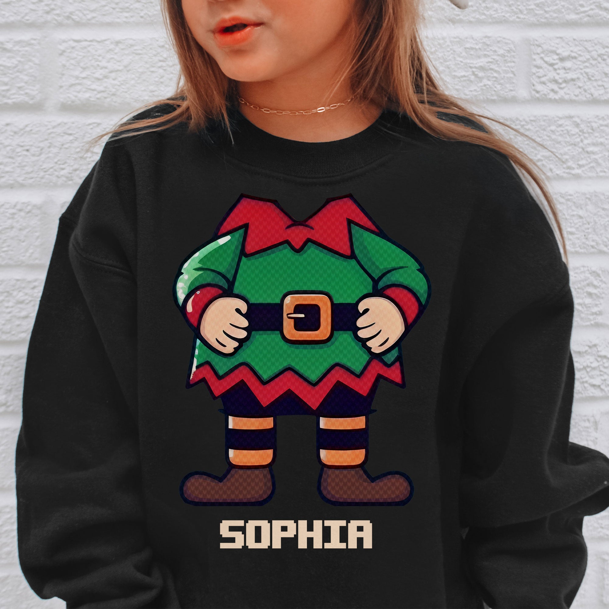 The sweatshirt features custom elf and santa costumes on the front of the sweatshirt. You can choose from different styles, colors, and sizes to make a cartoon-like representation of your son or daughter as an elf or a santa. You can also customize the sweatshirt with their name or any other text that you want. This is a way of showing your son or daughter how much you love them and how fun they are.